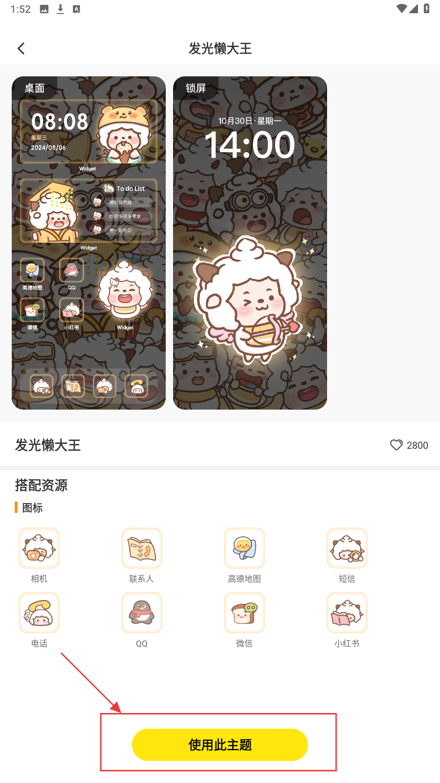 3、在【发光懒大王】详情页,点击【使用此主题】,应用该主题到桌面与锁屏。