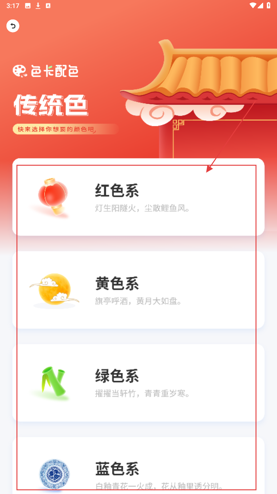2、在【传统色】页,按需选【红色系】【黄色系】等分类,查看对应色彩。