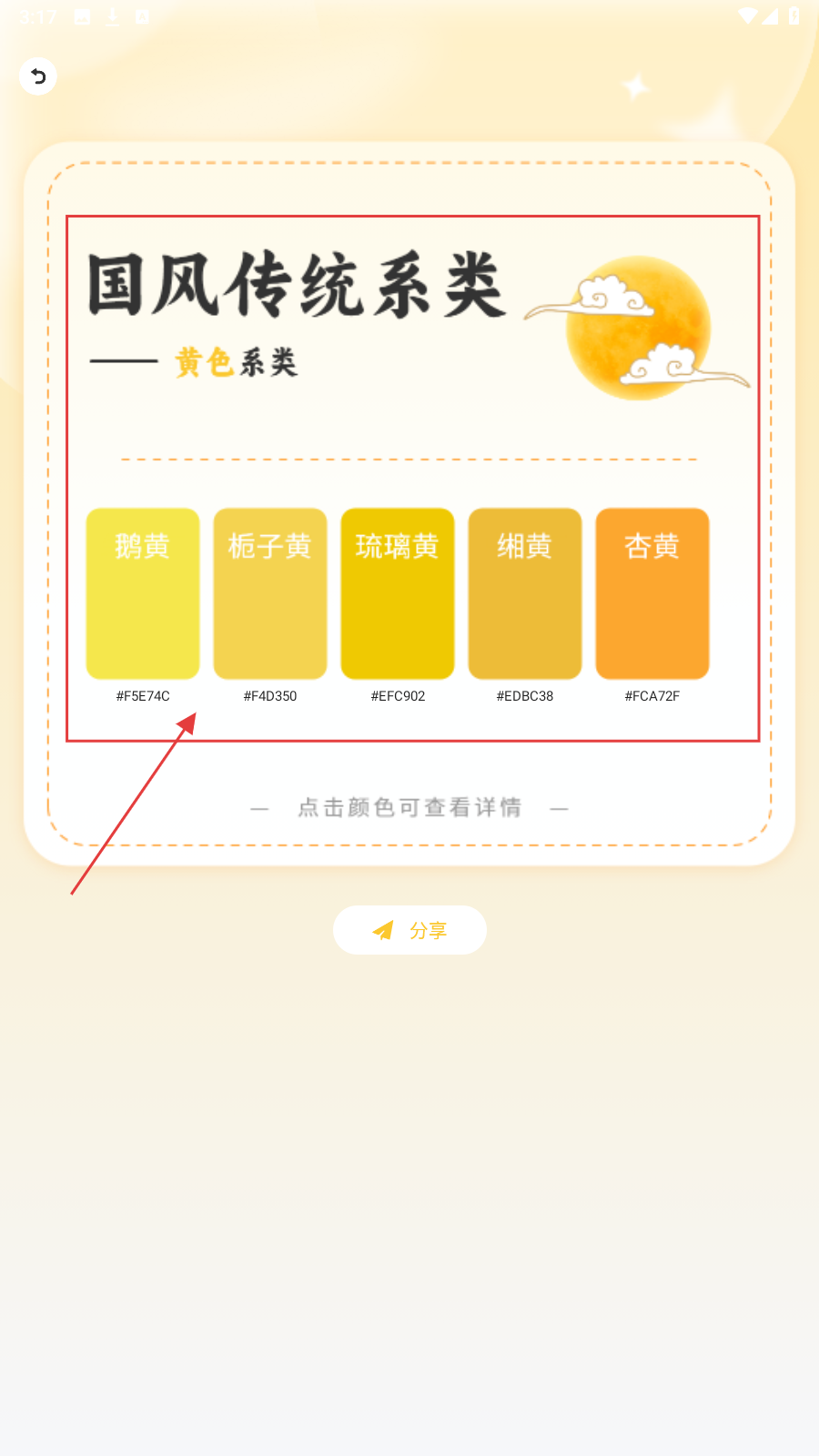 3、进入【国风传统系类-黄色系类】,点颜色如【鹅黄】查详情。
