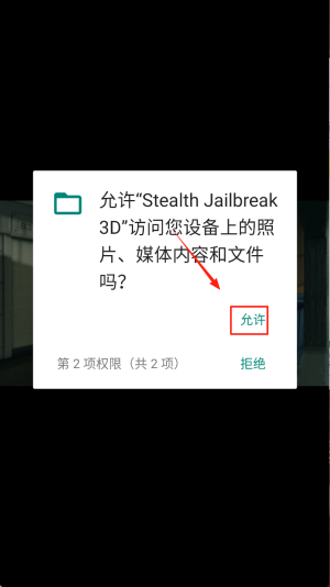 1、授权访问:看到“充许 StealthJailbreak 3D 访问您设备上的照片、媒体内容和文件吗?”弹窗时,点击“允许”即可继续。