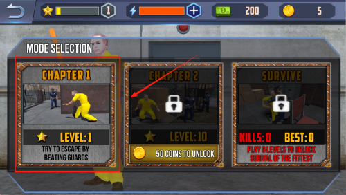 3、选择模式:进入“200 MODESELECTION CHAPTER1”界面,确认当前为第一章,点击“LEVEL:1”开始第一关。