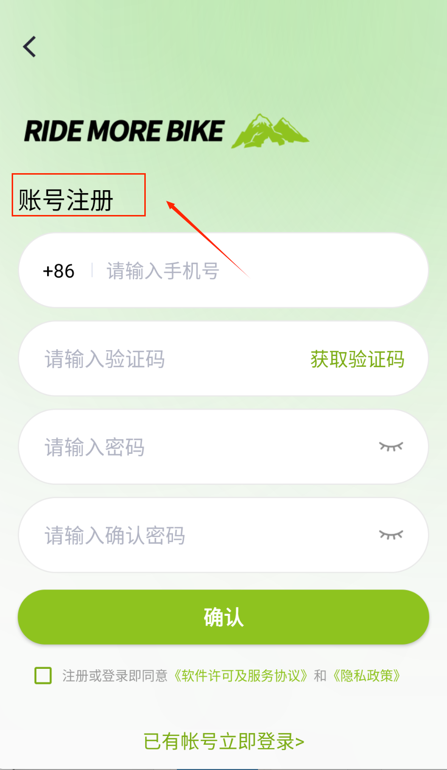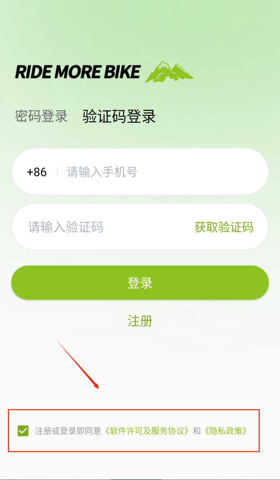 4、登录前千万勾选协议小框框哦,用短信登录就等验证码发来填,点绿色登录键就能开始记录骑行车啦。