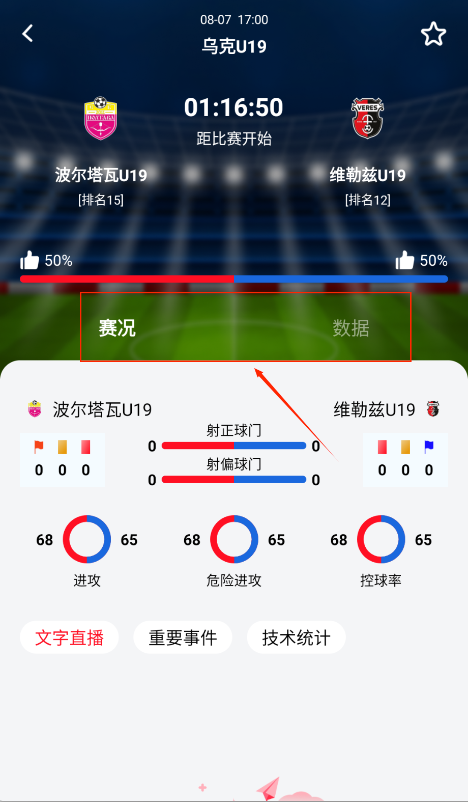 1、赛事直播与数据追踪,支持文字直播形式实时更新进球红黄牌等关键事件,附带技术统计图表。