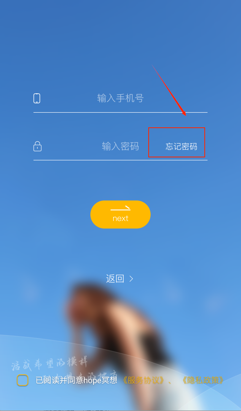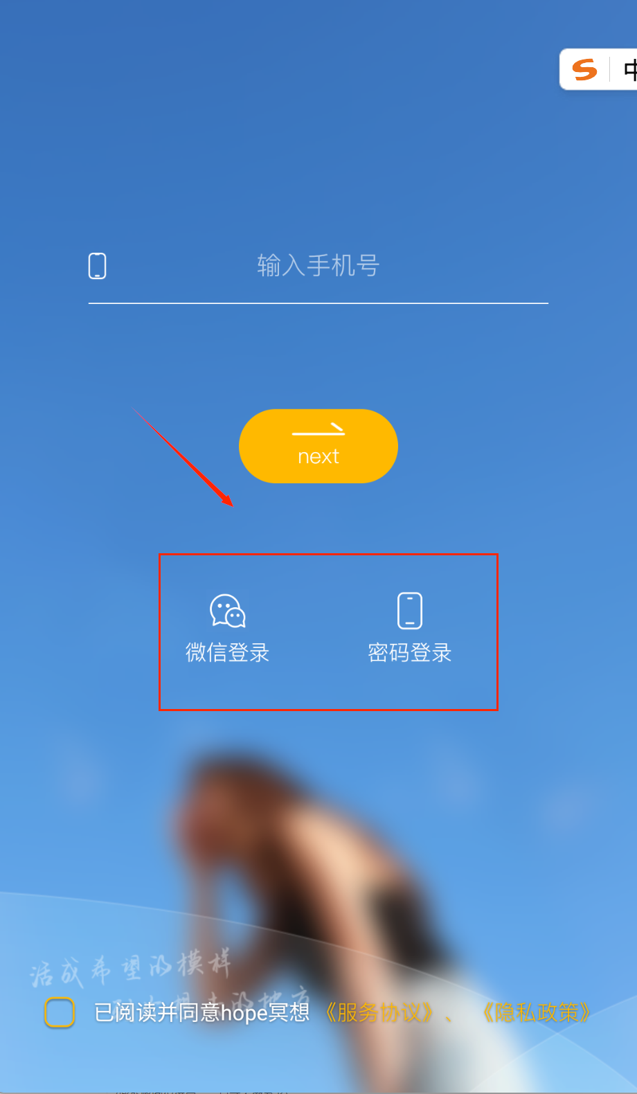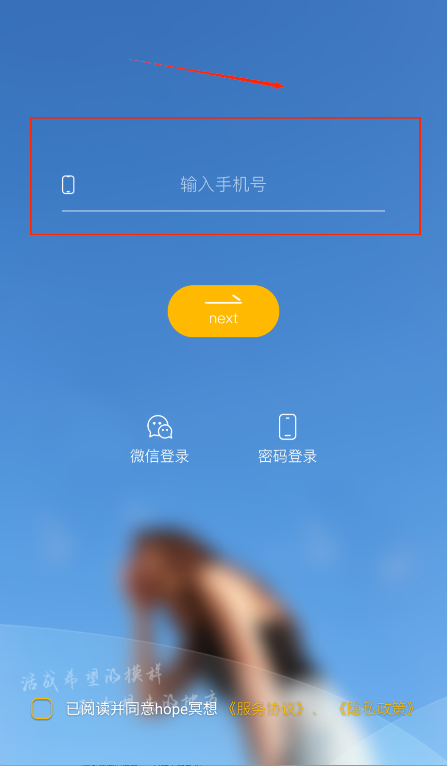 1、打开软件就能看到清爽的蓝色界面啦,在输入手机号的地方填好你的号码,点那个亮眼的黄色next按钮就能继续下一步咯。