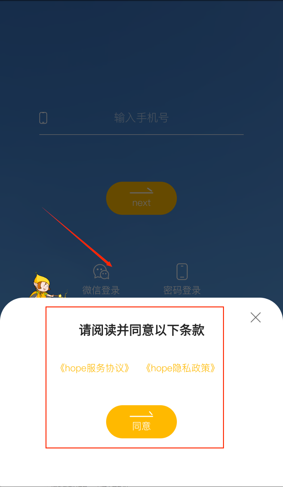 2、要是懒得输手机号也没关系呢,下面有微信登录和密码登录两个选项,点微信图标就能快速登录,超方便的。