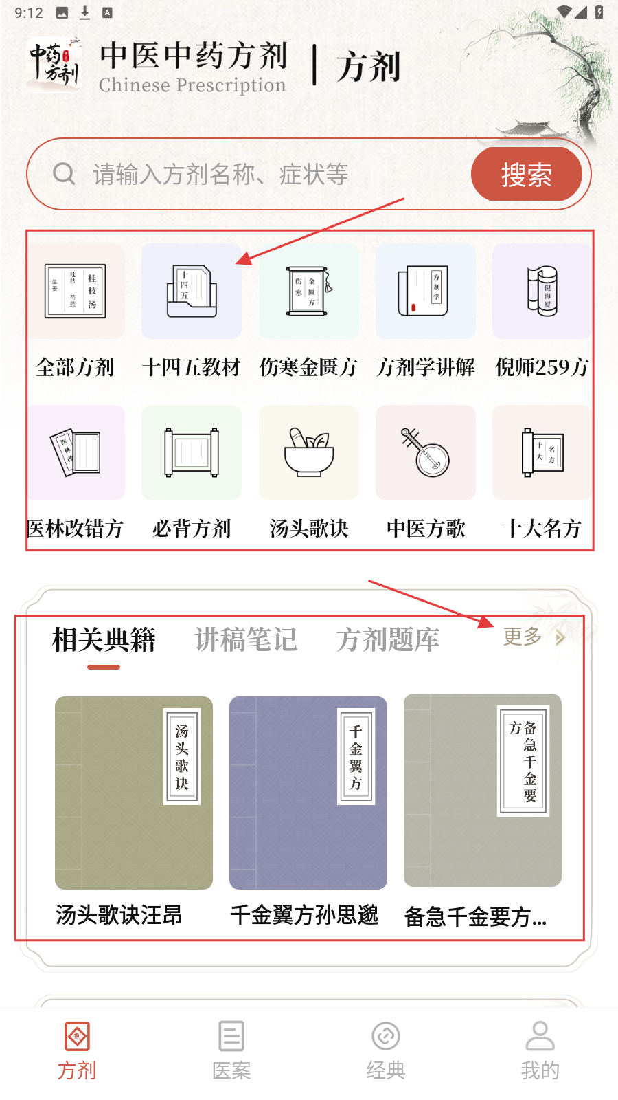1、打开应用,在【方剂】页面有全部方剂等功能按钮可以按需选择,下方还可以进行查看相关典籍,点击【更多】查看。