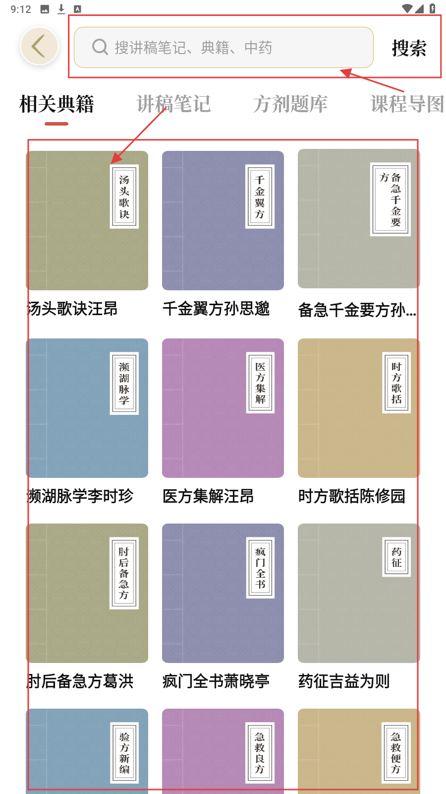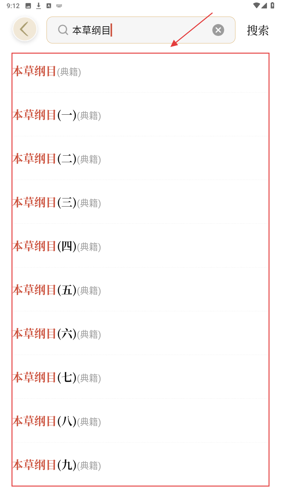 3、如在上方搜索本草纲目,下方跳出相关典籍,点击【搜索】按钮。