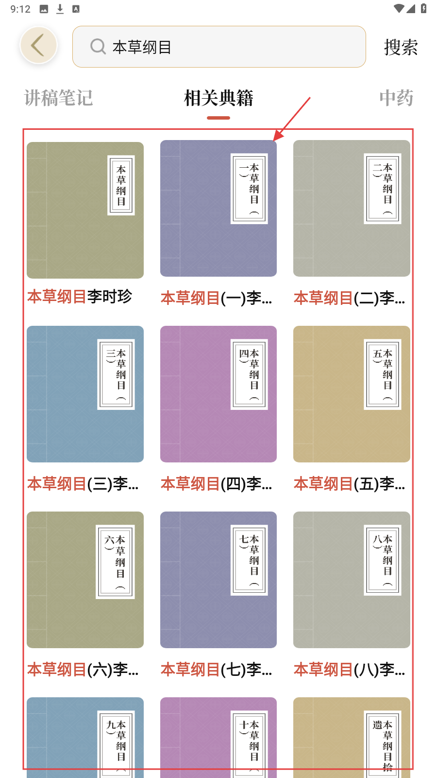 4、点击后可看到不同分册的【本草纲目】典籍,选择要看的典籍进入详情页学习中医知识即可。