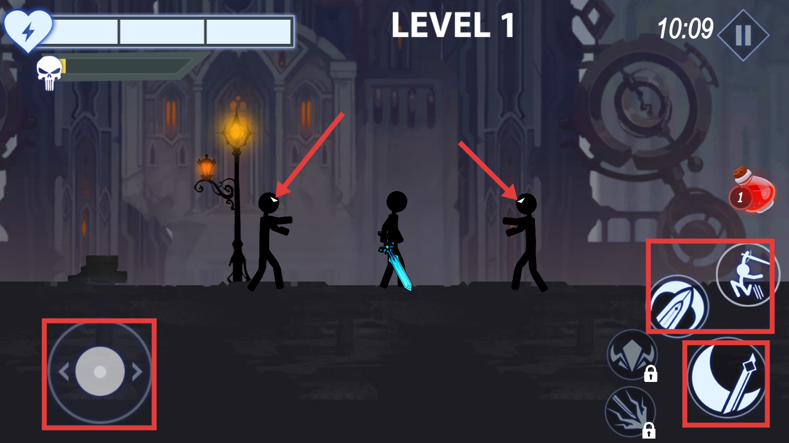 2、战斗时左下方摇杆控移动,右侧技能键攻敌人,熟悉操作应对【LEVEL-1】敌人攻势。