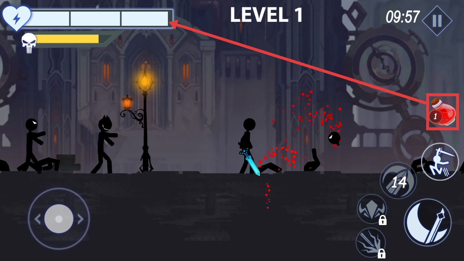 3、留意左上角血条,血量告急点右侧血瓶恢复,维持状态应对【LEVEL-1】持续战斗。