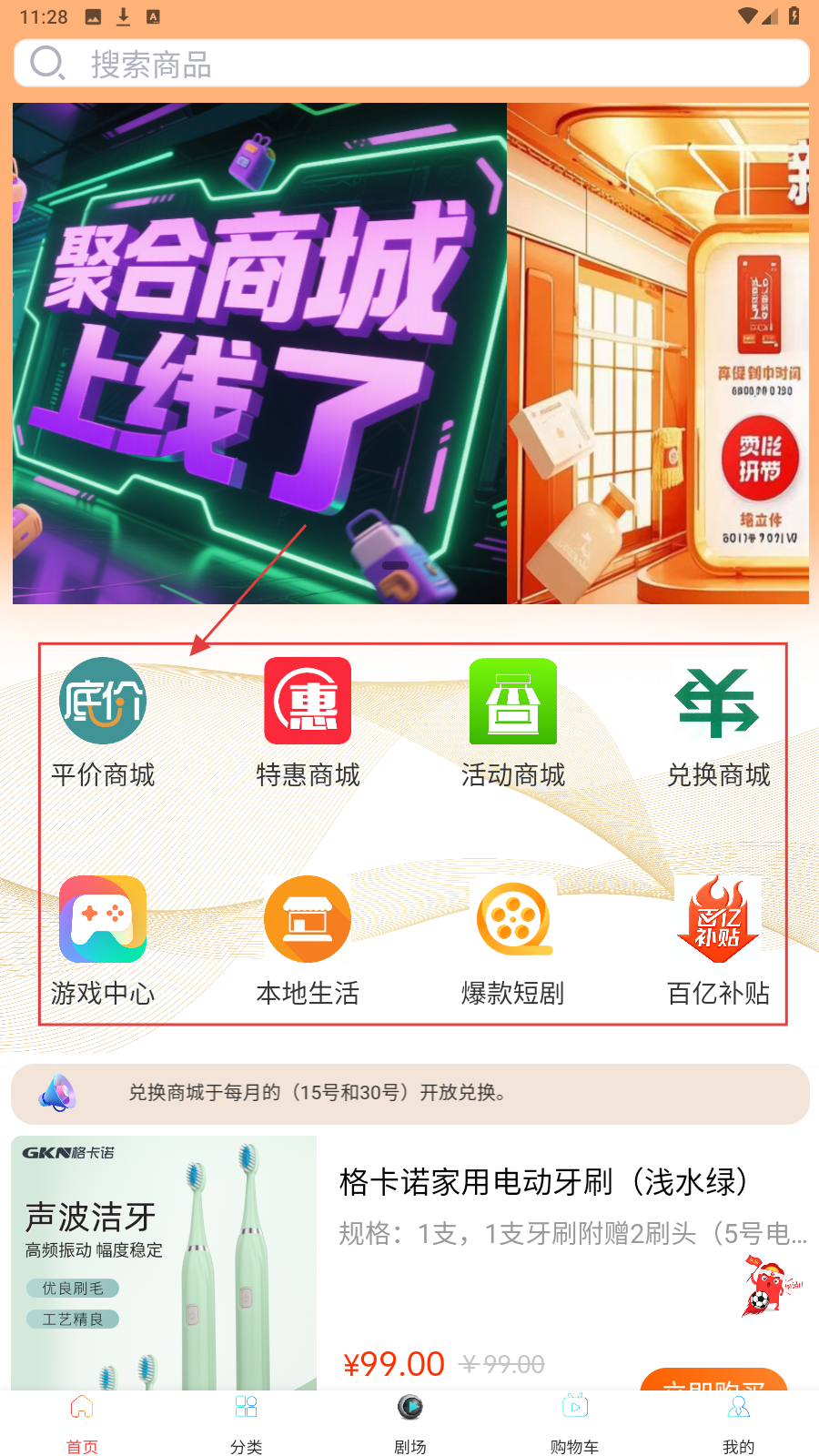 1、进入首页,可从【平价商城】【特惠商城】等入口,按需选购物频道。