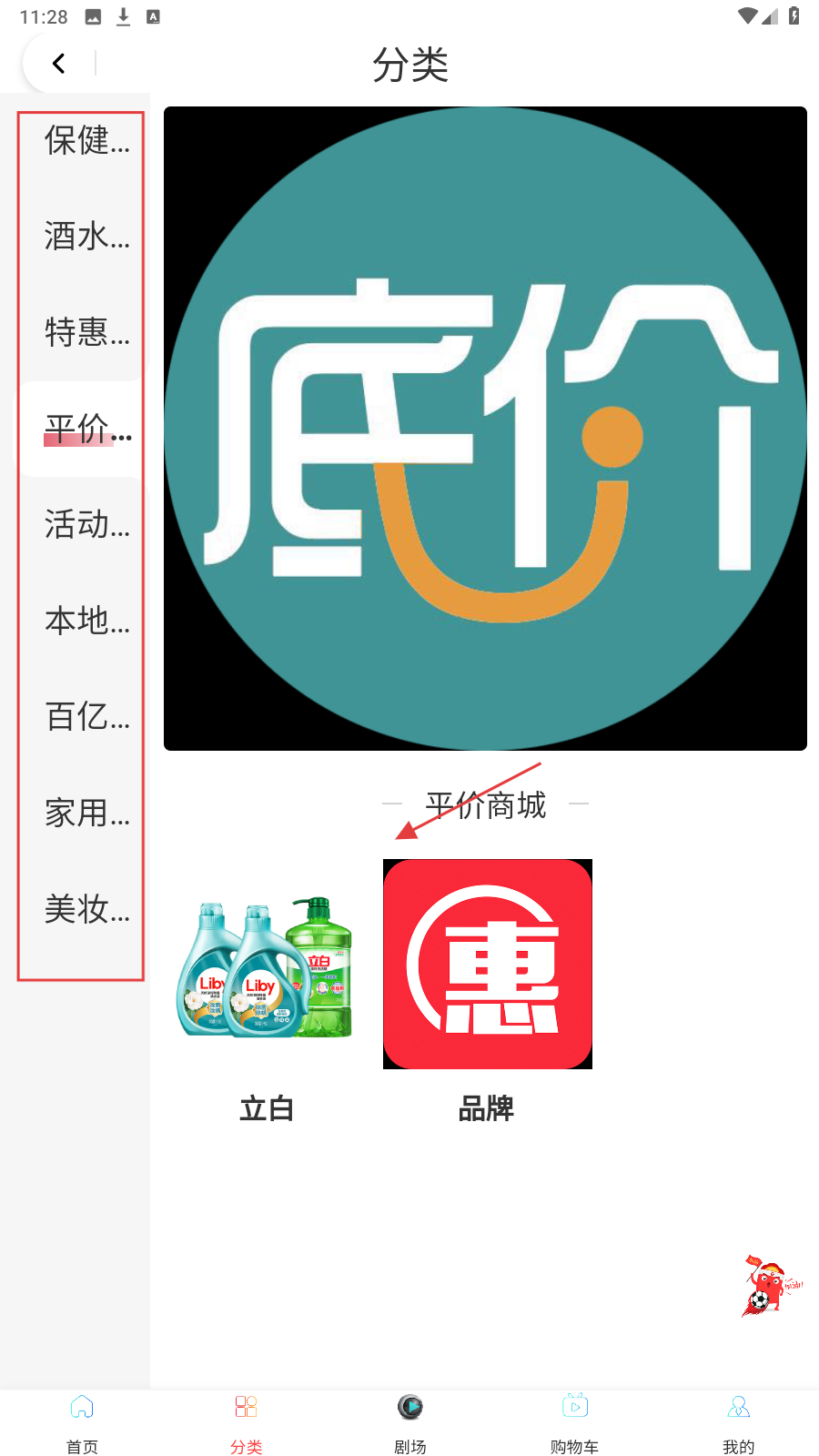 2、在分类页,左侧列表选分类,如【平价】,再挑具体商城或品牌。
