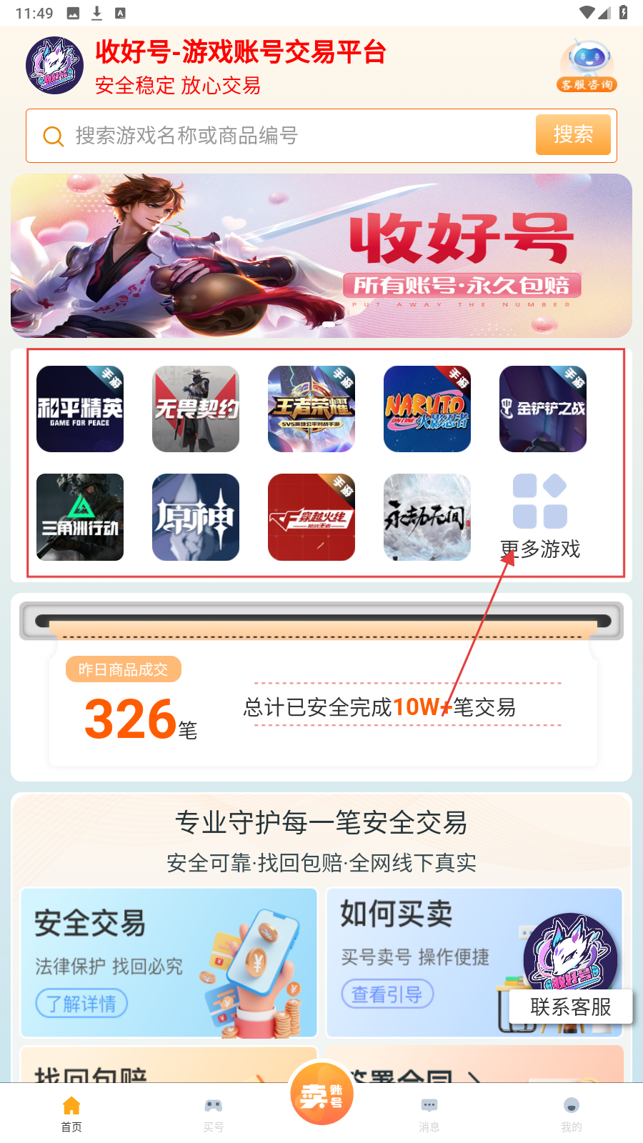 1、进入平台首页,从展示游戏中选目标,或点【更多游戏】找想交易的游戏。