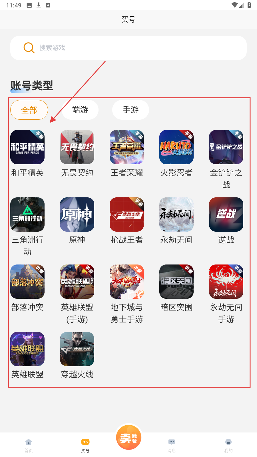 2、在【买号】页,通过【全部】【端游】【手游】筛选项,精准定位游戏分类。