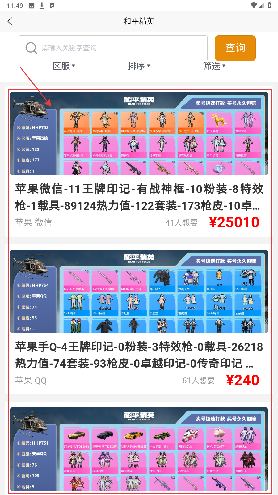 3、进入具体游戏(如和平精英)列表,依据账号展示的皮肤、载具等信息选心仪账号。