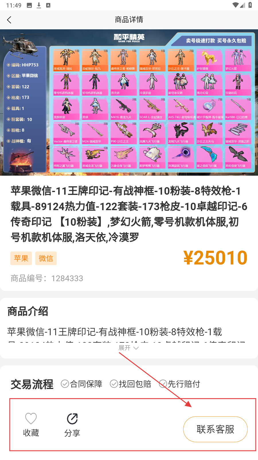 4、在商品详情页,若有意向,点【联系客服】沟通交易细节,推进账号购买。
