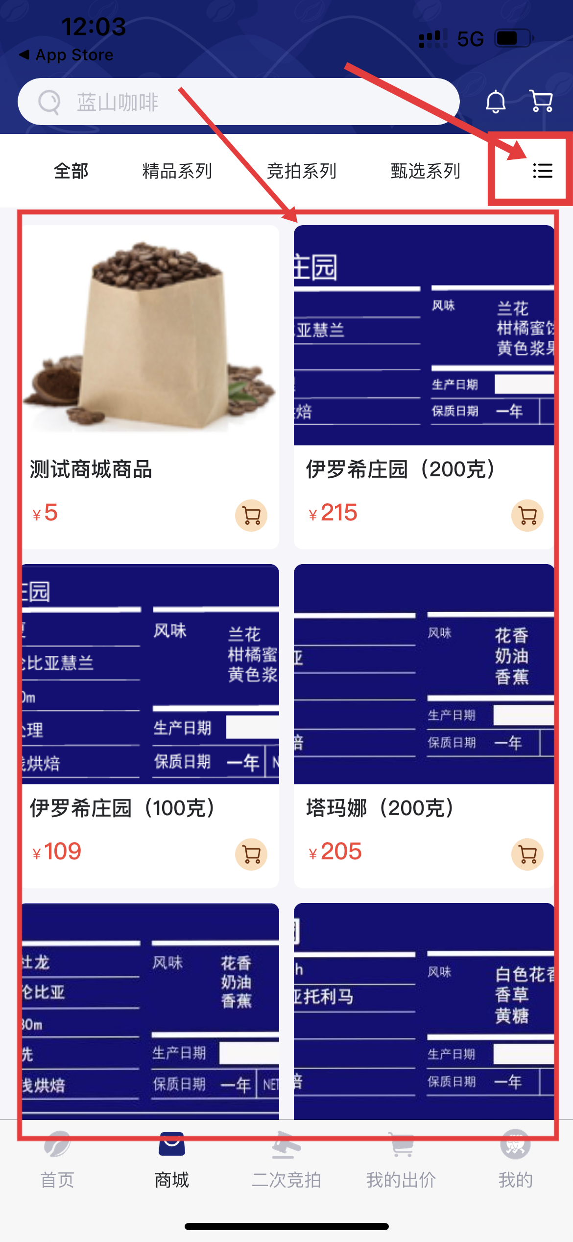 1、打开应用后,点右上角菜单图标,切换商品展示模式找目标。