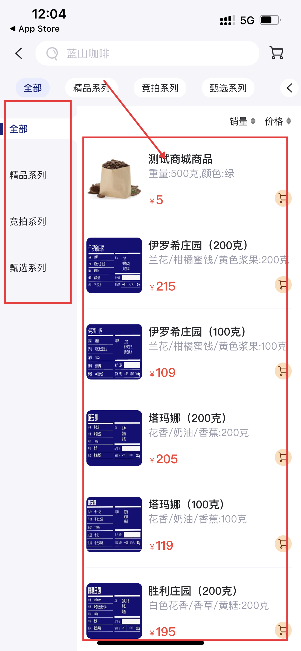 2、借左侧分类(全部/精品等)筛商品,在列表选心仪咖啡查看详情。
