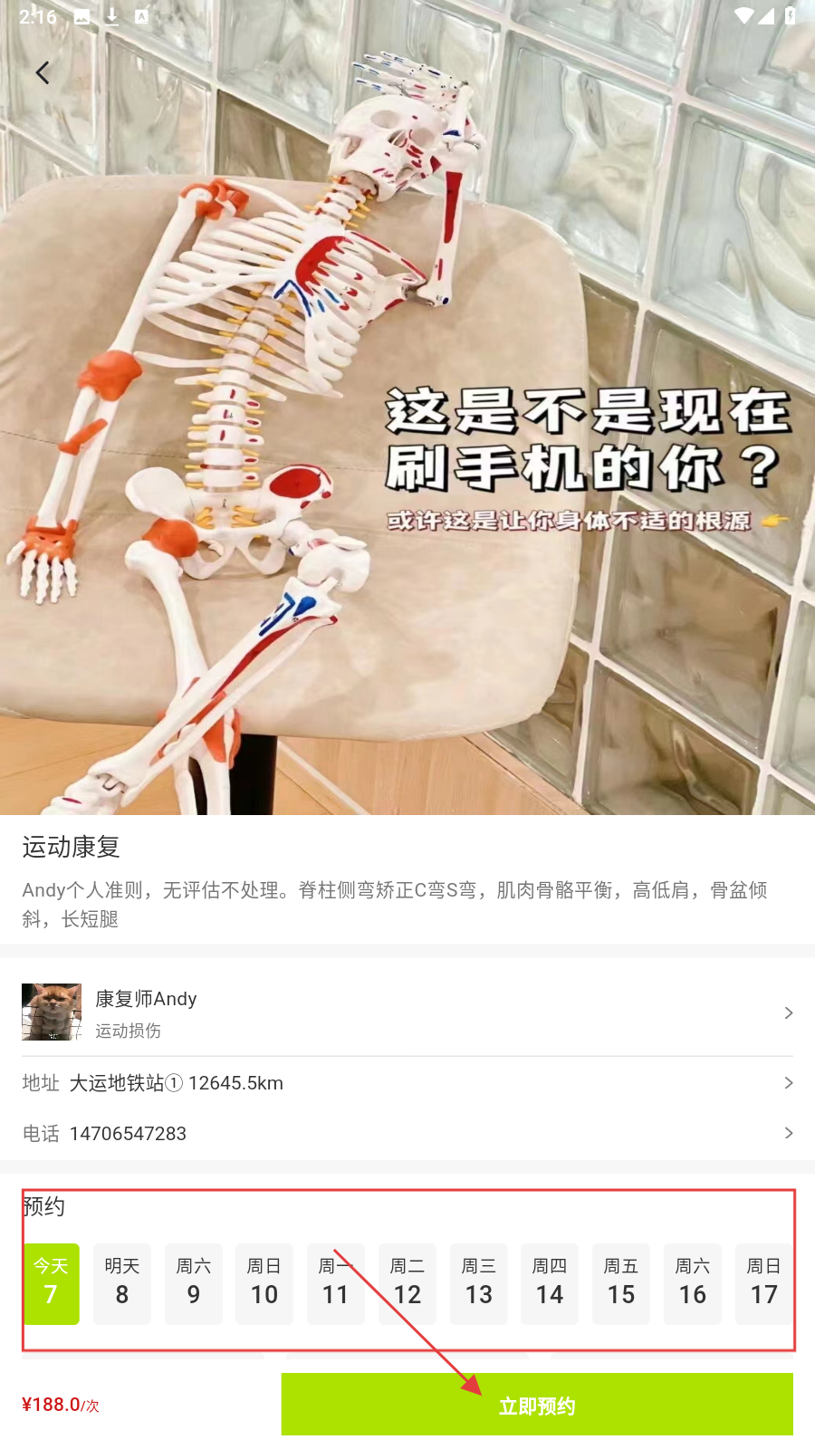 3、选好康复项目后,确定预约日期,点击【立即预约】进入订单确认环节。