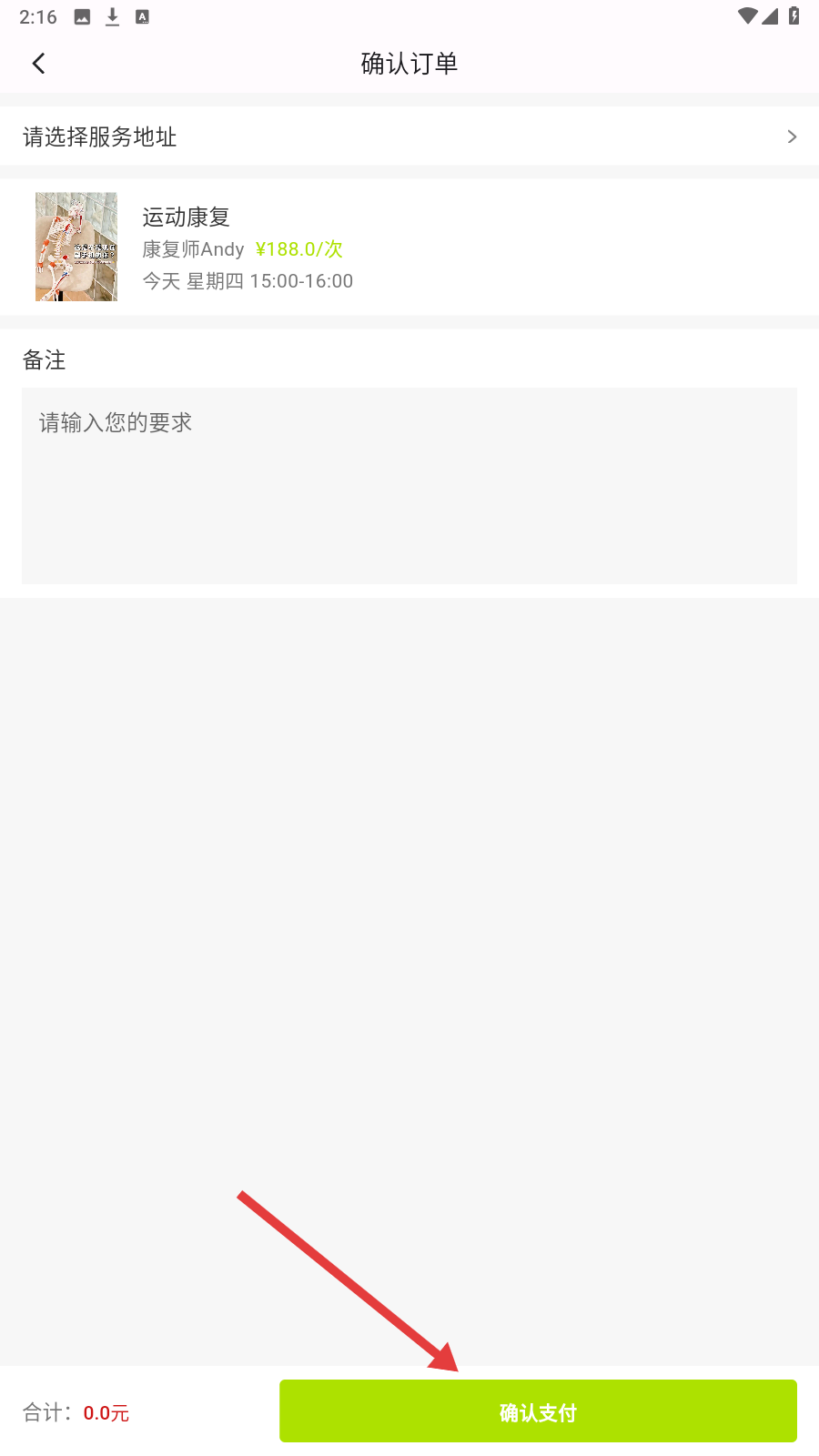4、确认订单信息,选服务地址、填备注,最后点【确认支付】完成康复预约。