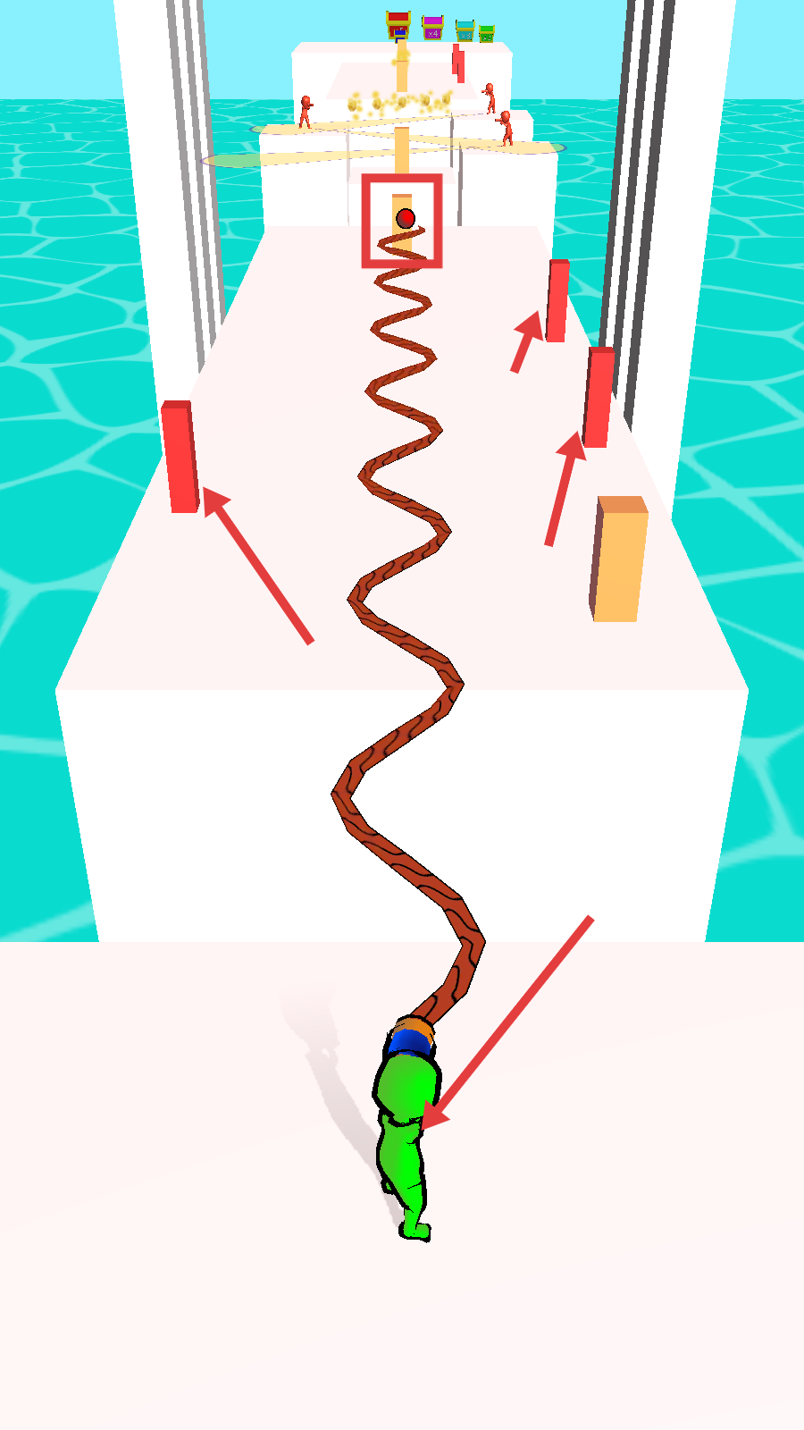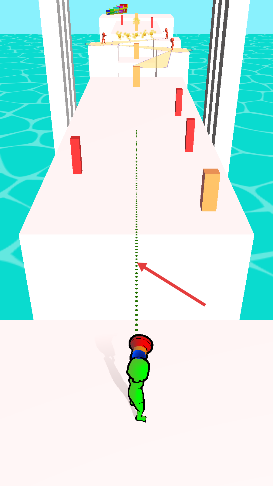 2、发射轨迹时规划【螺旋-路线】,绕开【红色-柱子】,精准击中前方目标推进关卡。
