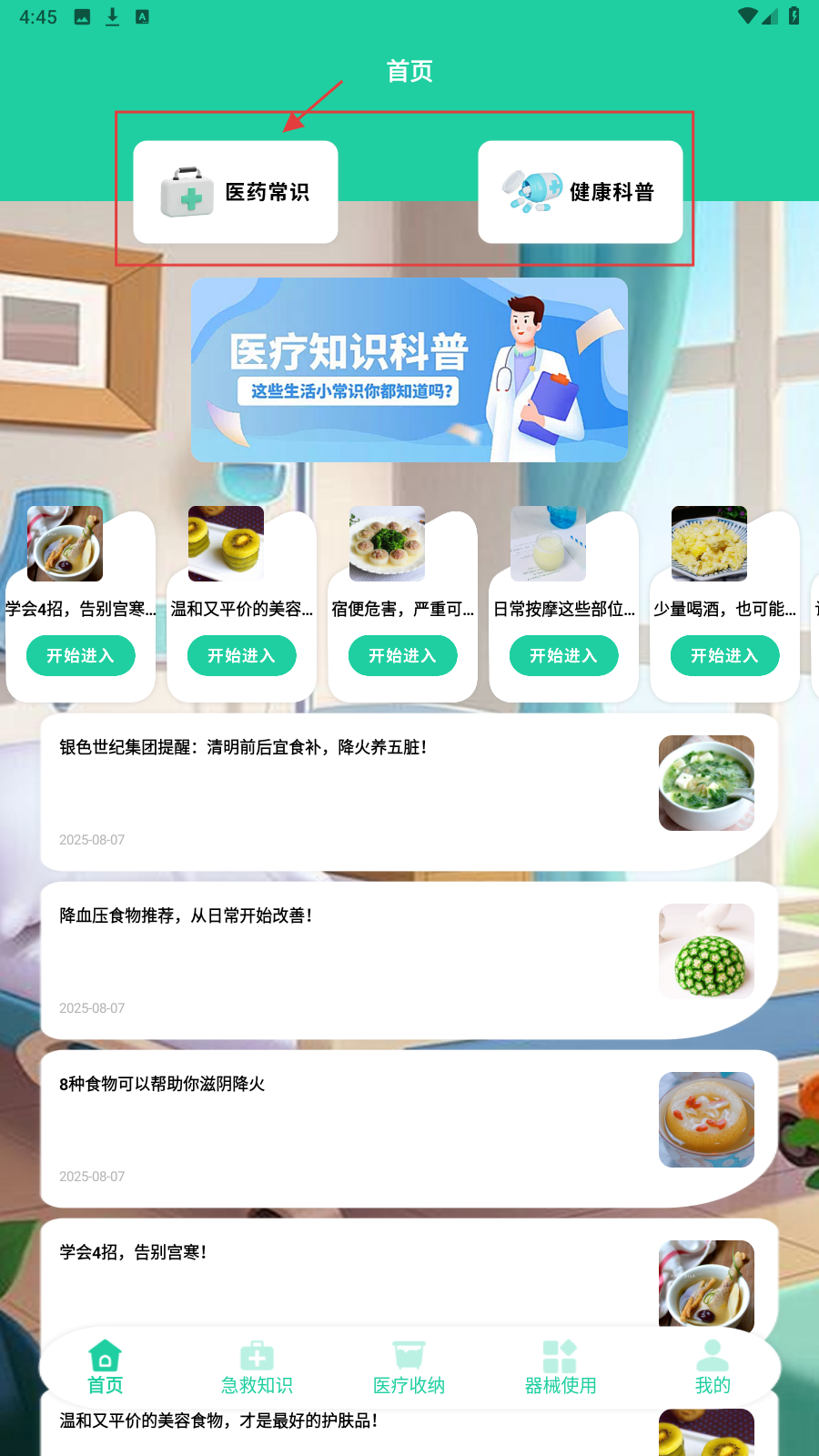 1、打开APP首页,选【医药常识/健康科普】,进入知识列表。