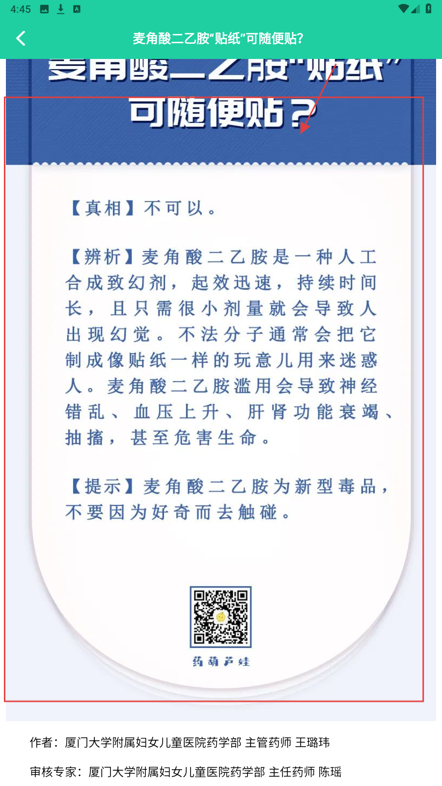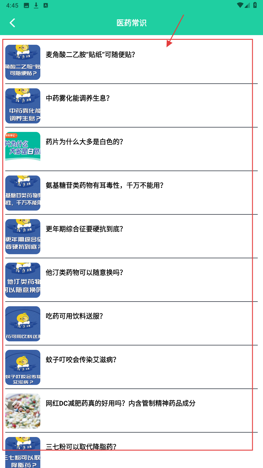 2、在【医药常识】页,浏览知识标题,选感兴趣的内容,如“麦角酸二乙胺‘贴纸’可随便贴?”。