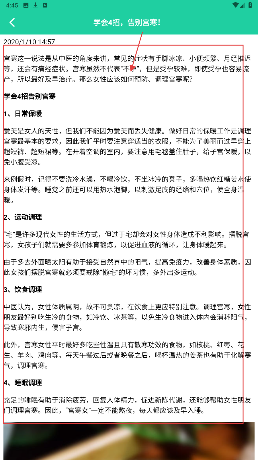 4、返回首页,选健康科普文章,如“学会4招,告别宫寒!”,查看调理方法,提升健康认知。