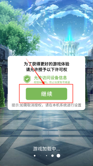 2、授予权限:接着,在“访问设备信息”提示框中点击“继续”,允许游戏获取设备信息以保护账号安全。