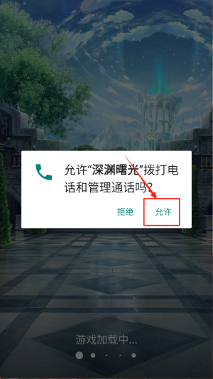 3、通话权限:然后,当系统询问“允许深渊曙光拨打电话和管理通话吗”时,点击“允许”继续游戏加载。