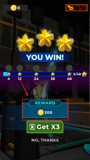 1、领取奖励:在“YOU WIN!”界面点击“REWARD”领取200金币,或选“NO,THANKS”跳过。