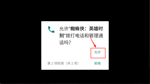 2、授权通话:当系统询问“允许蜘蛛侠:英雄时刻拨打电话和管理通话吗”时,选择“允许”完成第二项权限授权。