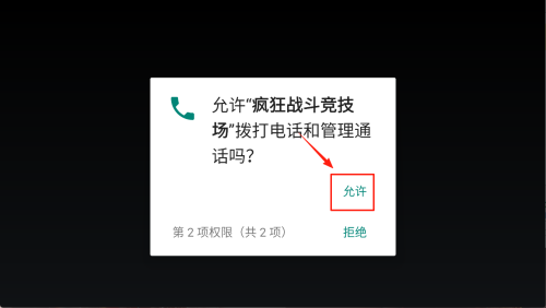 2、授权通话:在权限弹窗中点击“允许”授予“疯狂战斗竞技场”拨打电话和管理通话权限。