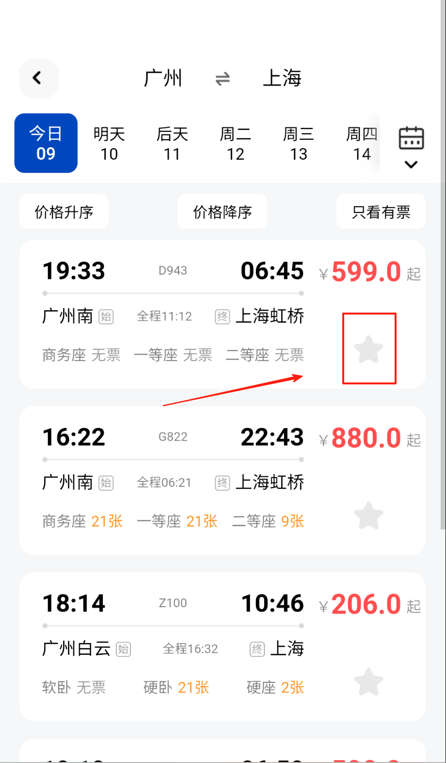 2、收藏心仪车次便于后续查看,设置低价提醒功能自动推送符合预算的特惠票,避免错过优惠购票时机。