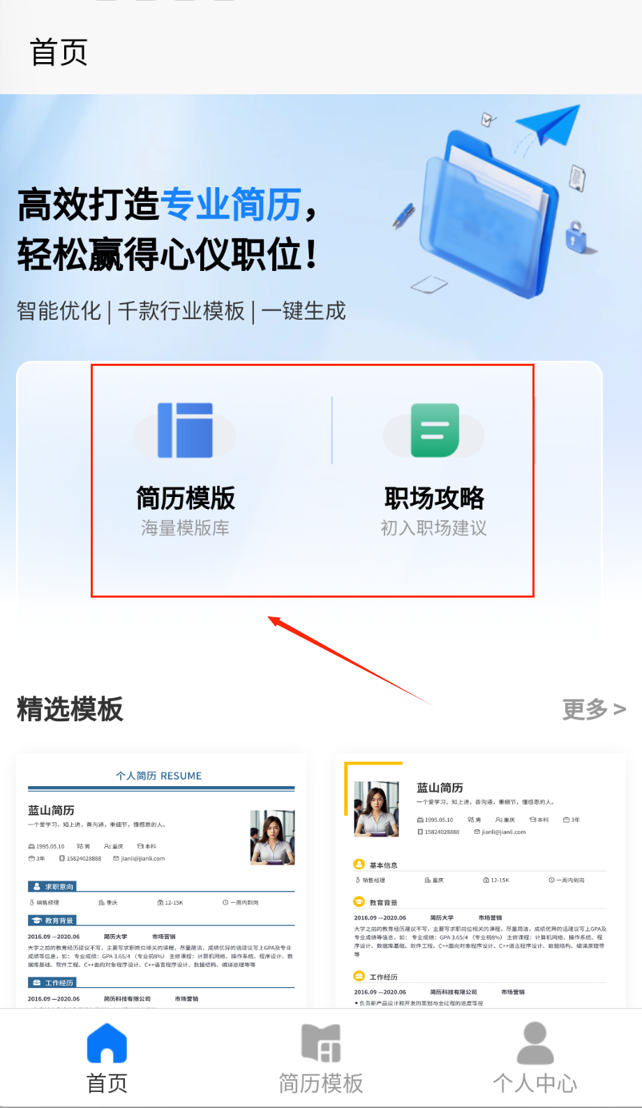 1、打开应用选择适合的行业模板,系统会根据当前热门职位推荐匹配度高的简历样式,新手引导分步介绍编辑功能。