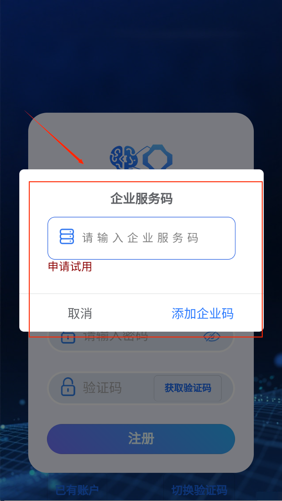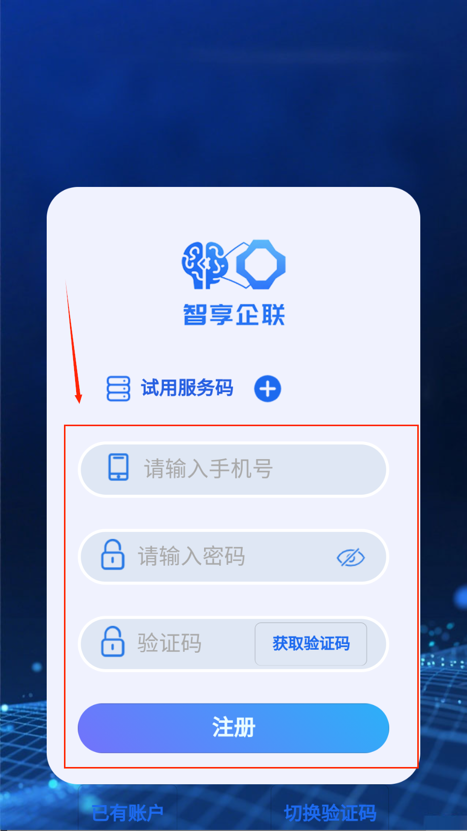 3、获取验证码后要在有效期内填写,收不到可以点重新发送,企业用户需要先申请试用服务码才能注册。
