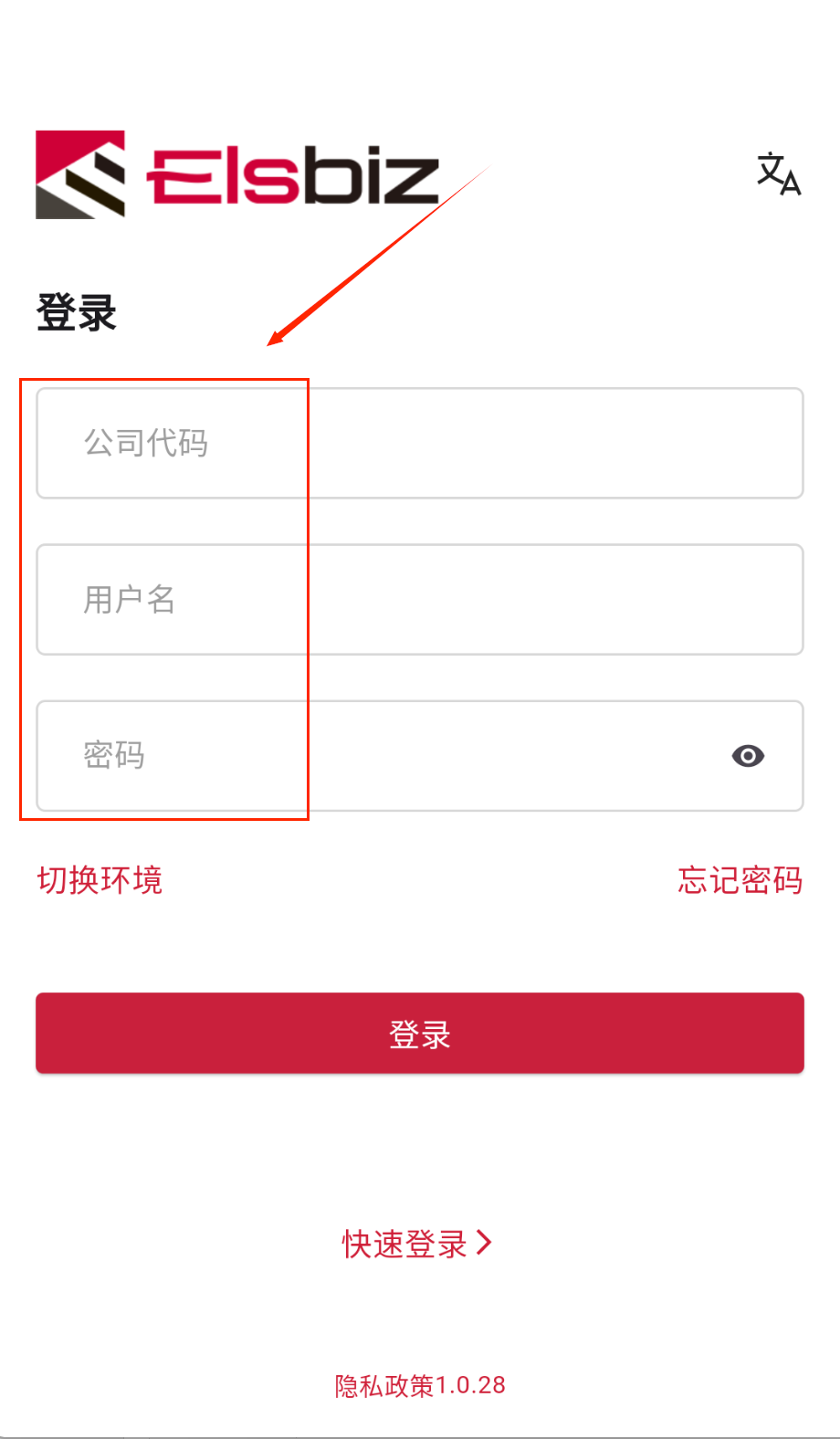 2、在登录界面需要依次填写公司代码、用户名和密码,密码框右边的小眼睛可以切换显示隐藏,记得检查输入是否正确。