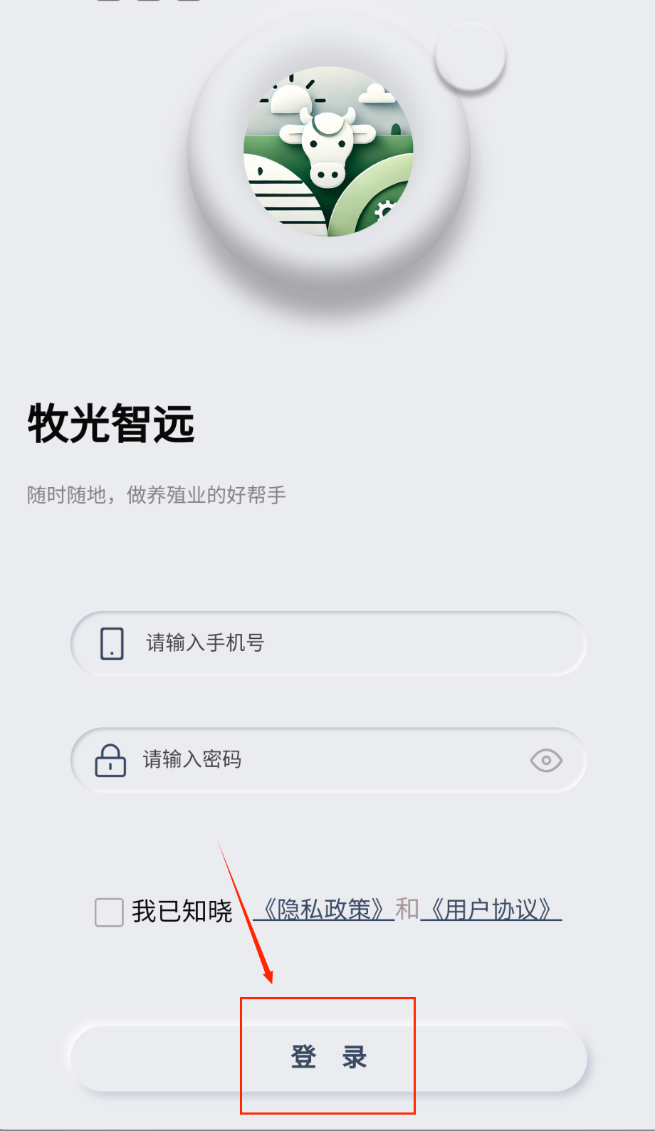 4、主界面有头可爱的小牛图案,下面写着"随时随地做养殖好帮手",点登录就能开始记录你家牛羊的信息了。