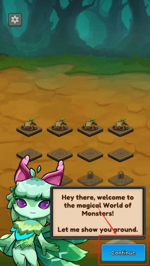2、继续教程:在游戏教程界面点击“Continue”,让小怪物带你了解游戏世界。