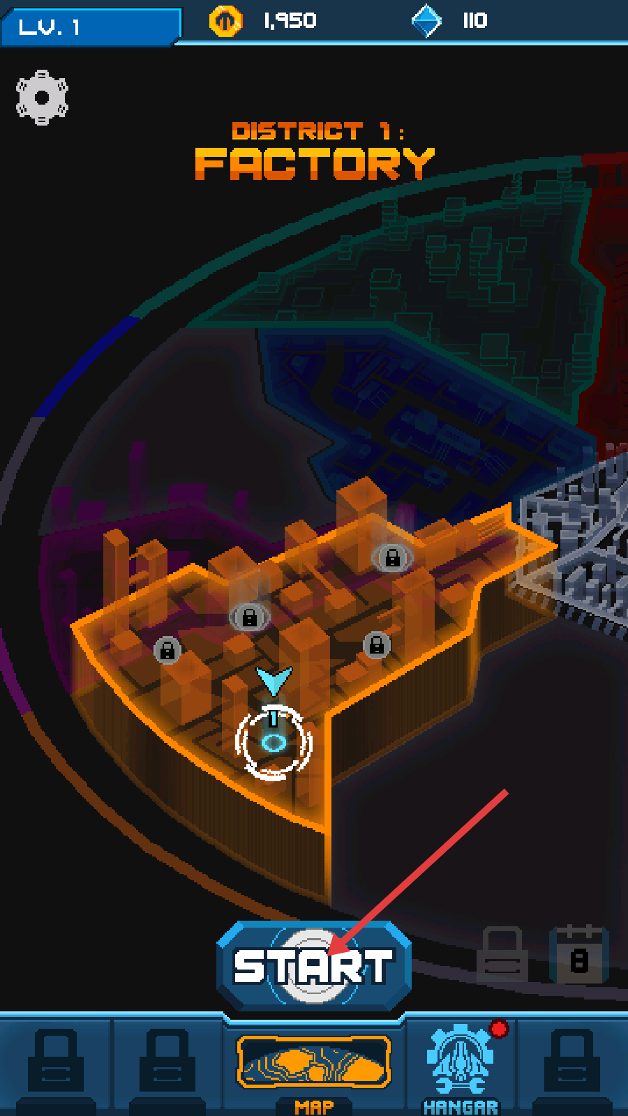 1、进入【DISTRICT-1:FACTORY】地图,点击【START】开启首关,攻克初始区域为解锁后续地图铺垫。