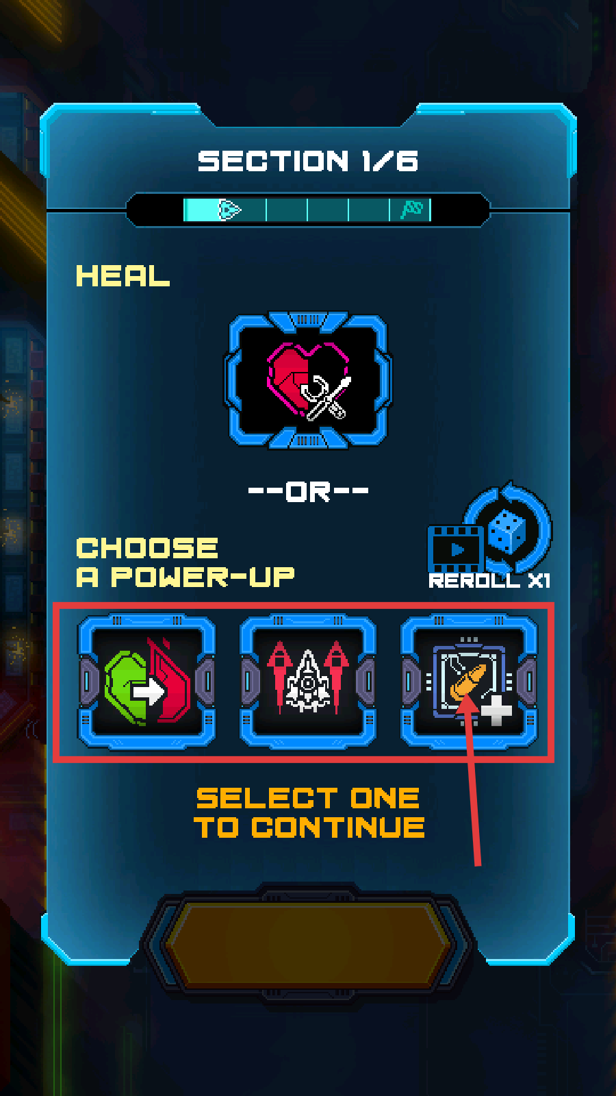 3、在【SECTION-1/6】界面,依据血量和战况,选攻击或续航强化,提升后续关卡作战能力。