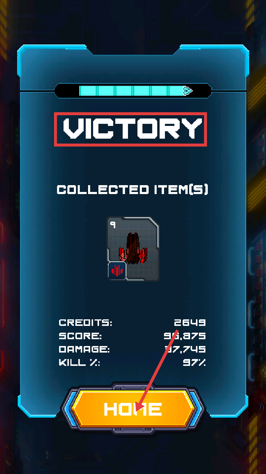 4、通关后查看【VICTORY】结算,领奖励后点【HOME】返回,积累资源用于战力强化。