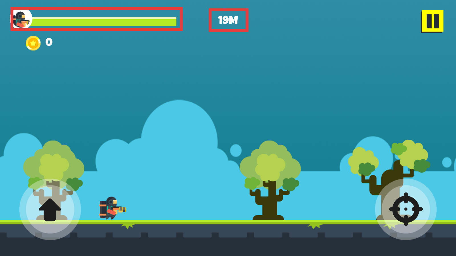 2、关注左上角【血量条】,初始推进距离【19M】,先熟悉角色移动射击操作。