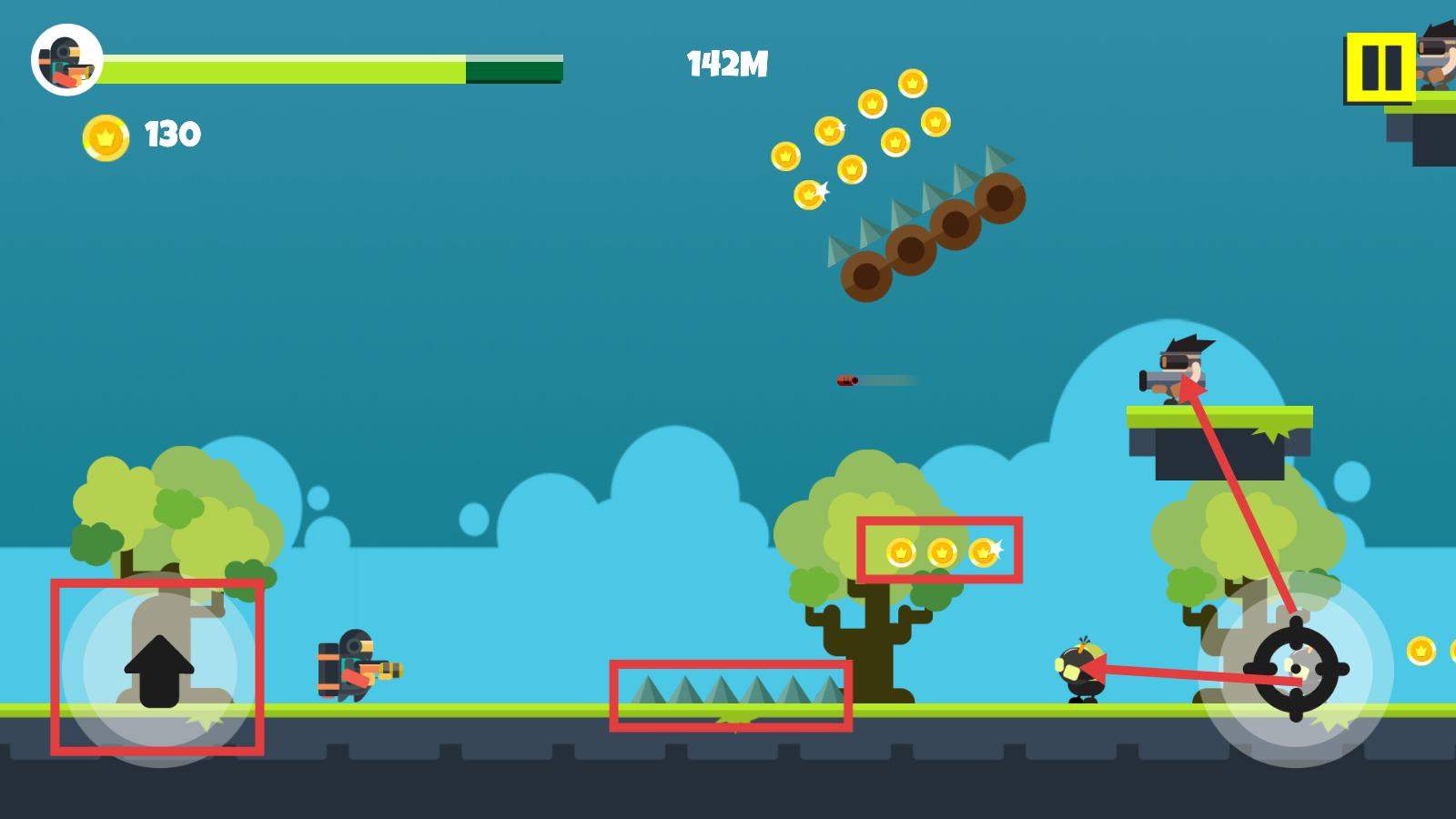 3、遇【金币】优先收集,规避【尖刺-障碍】,射击敌人,借左侧按钮控角色飞行。