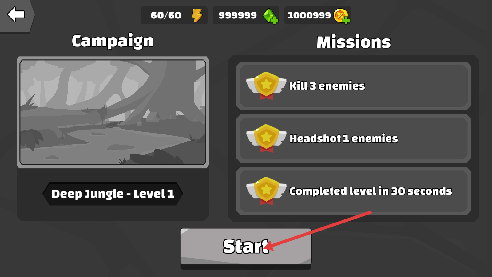 1、点击【Start】开启【Deep-Jungle-Level-1】,优先推进【Kill-3-enemies】等任务,规划战斗节奏提升效率。