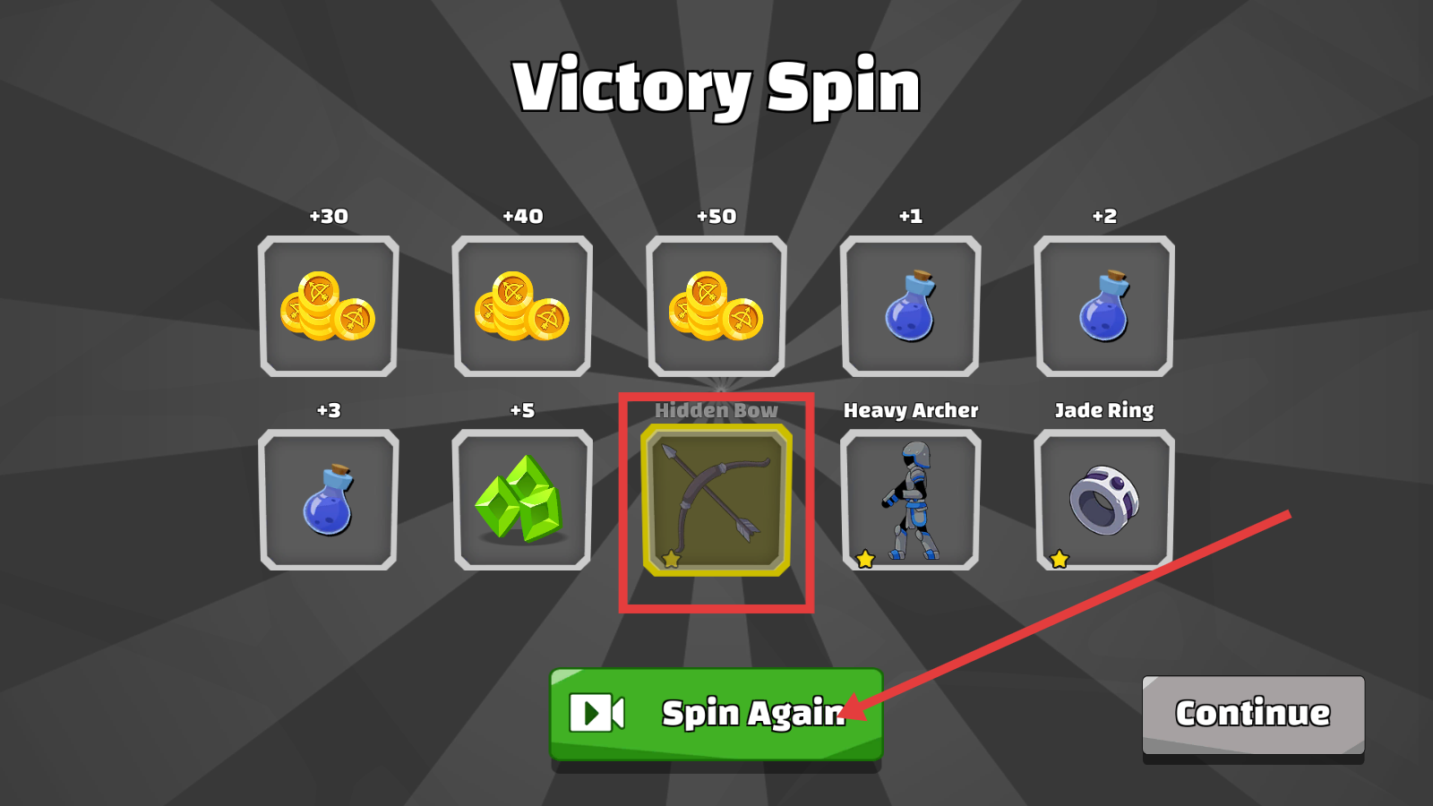 4、通关后参与【Victory-Spin】抽奖,若未得心仪道具,点击【Spin-Again】再试,积累资源强化角色。