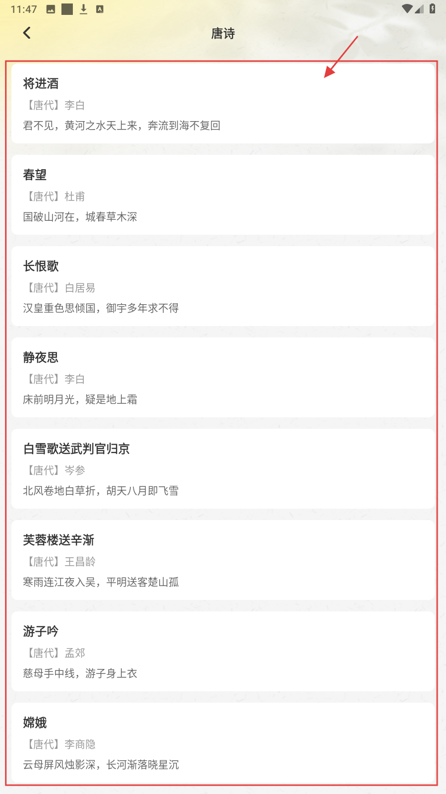 2、在【唐诗】列表,选感兴趣诗作,如《将进酒》,进入详情开启学习。