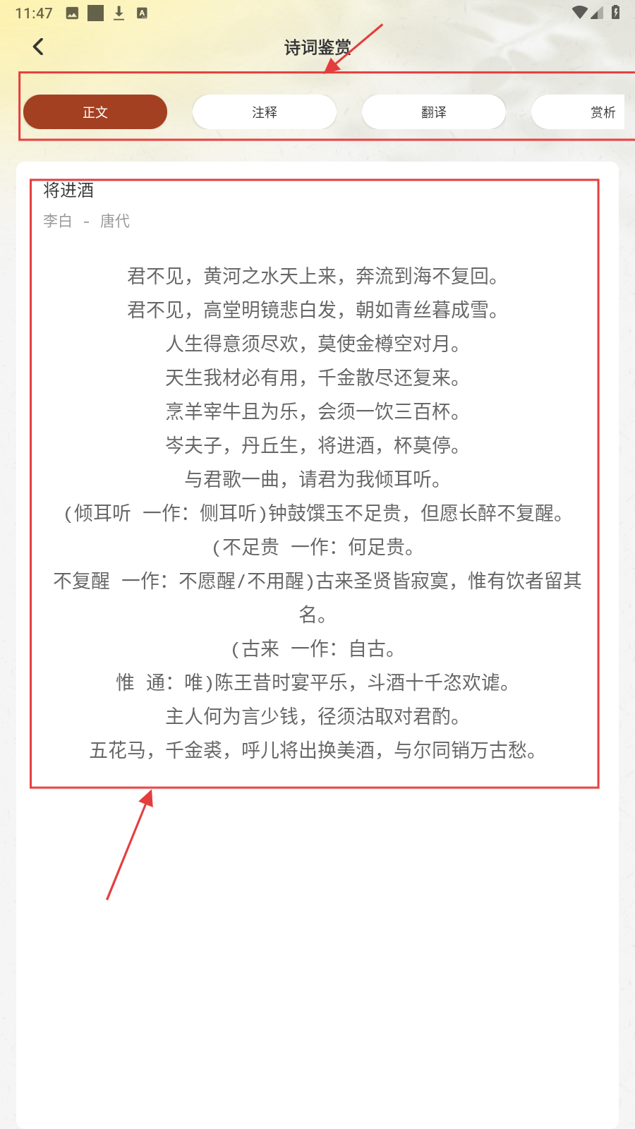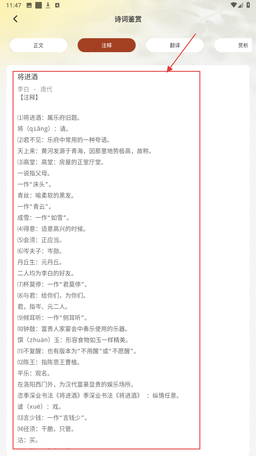 4、点【注释】标签,查阅诗句字词解释,辅助理解诗词含义与背景。