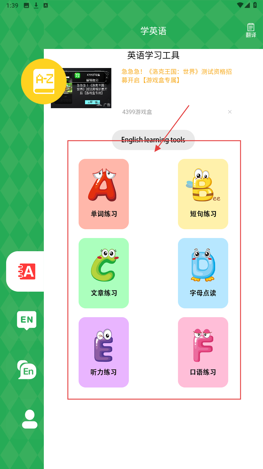 1、进入【学英语】页,选【单词练习】【短句练习】等工具,开启对应英语学习。