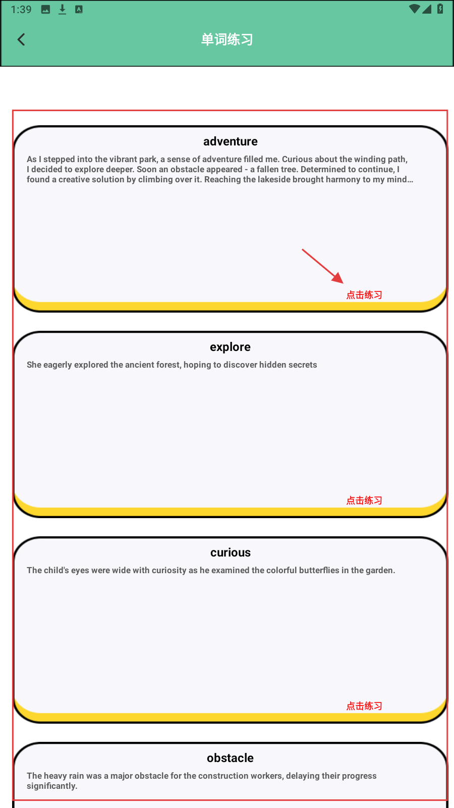 2、在【单词练习】列表,点单词如“adventure”的【点击练习】,进入练习界面。